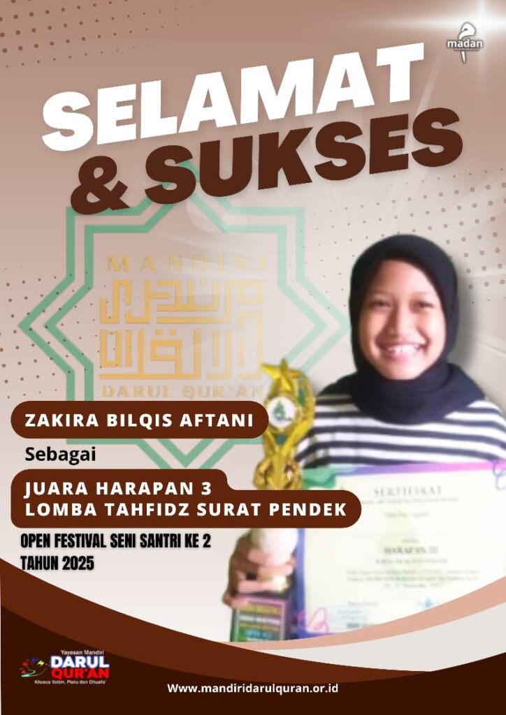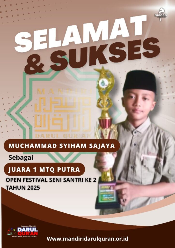 Selain sebagai ajang kompetisi, festival ini juga menjadi wadah silaturahmi antar-santri serta penguatan nilai-nilai keislaman melalui seni. Dengan kemenangan ini, Mandiri Darul Quran berharap dapat terus mencetak generasi Qur’ani yang berakhlak mulia, cerdas, dan berprestasi.