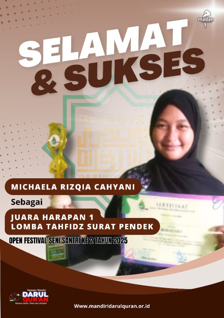 • Juara Harapan 1 Pembacaan Surat Pendek Michaela Rizqia Cahyani