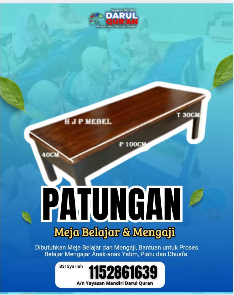 Di tengah semangat menimba ilmu dan meraih masa depan yang cerah, anak-anak yatim dan dhuafa di Panti Asuhan Mandiri Darul Quran masih menghadapi berbagai keterbatasan. Salah satu kebutuhan yang sangat mendesak saat ini adalah meja belajar yang layak.
