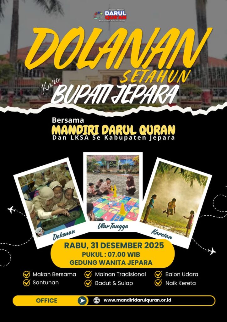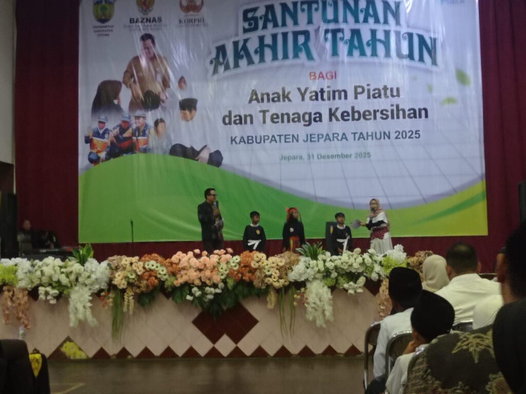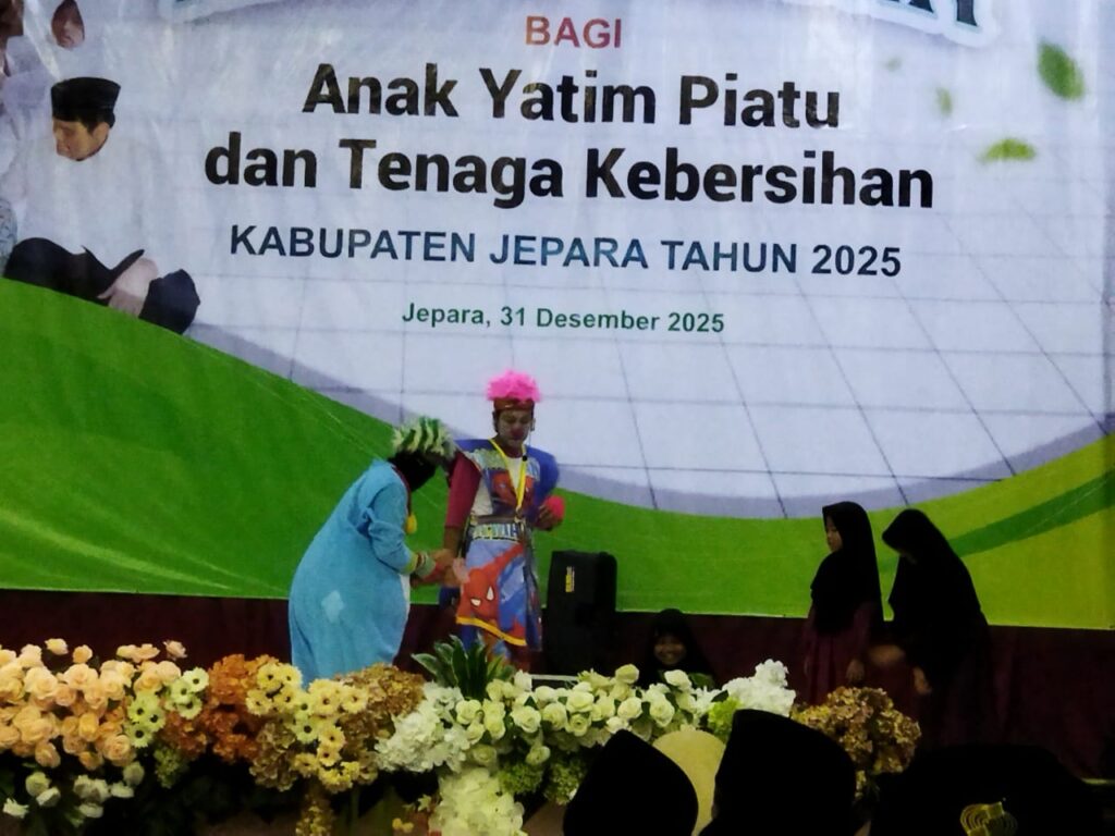 Jepara, 31 Desember 2025- Bupati Jepara Witiarso Utomo menggelar kegiatan santunan anak bersama Lembaga Kesejahteraan Sosial Anak (LKSA) yang dirangkai dengan permainan tradisional di Gedung Wanita Jepara. Kegiatan ini berlangsung dengan penuh kehangatan dan keceriaan, sebagai bentuk kepedulian Pemerintah Kabupaten Jepara terhadap kesejahteraan serta tumbuh kembang anak-anak.