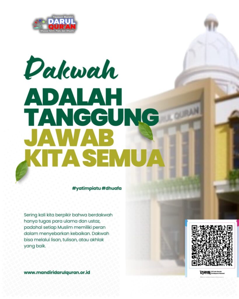 Dakwah merupakan amanah mulia yang Allah SWT titipkan kepada seluruh umat Islam. Dakwah tidak hanya menjadi tugas para ulama, ustadz, atau lembaga keagamaan tertentu. Dakwah adalah tanggung jawab kita semua, sesuai dengan kemampuan dan peran masing-masing. Termasuk di dalamnya lembaga seperti Mandiri Darul Qur’an, yang berikhtiar menjalankan dakwah melalui pendidikan, pembinaan, dan pengabdian sosial.