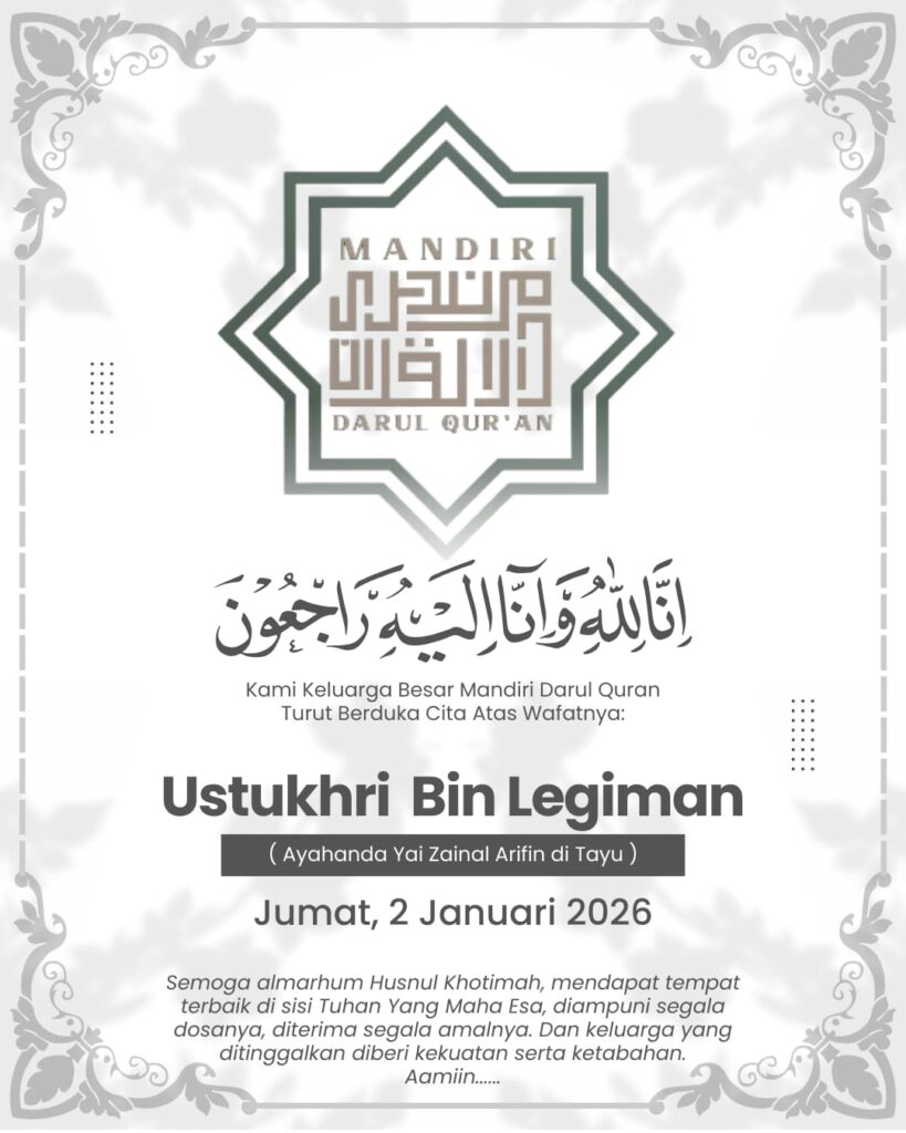 Atas nama keluarga besar Mandiri Darul Qur’an, kami menyampaikan doa dan simpati yang mendalam. Semoga Allah SWT melimpahkan rahmat-Nya kepada almarhum Bapak Ustukhri bin Legiman dan menghimpunkannya bersama orang-orang yang beriman dan bertakwa.