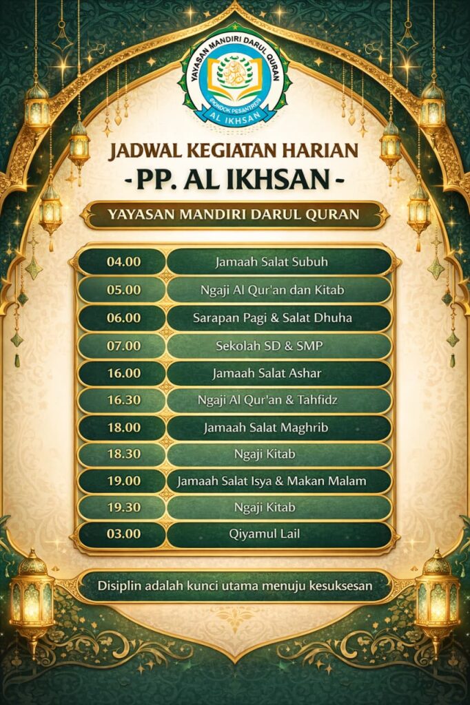 Pondok Pesantren Mandiri Darul Qur’an terus berupaya menciptakan lingkungan belajar yang kondusif dan penuh keteladanan. Para pendidik tidak hanya mengajarkan ilmu, tetapi juga menanamkan nilai disiplin melalui contoh nyata dalam keseharian. Dengan sinergi antara jadwal yang tertib, pendampingan guru, dan kesadaran santri, diharapkan lahir generasi yang cinta Al-Qur’an, berilmu, dan berakhlak mulia.